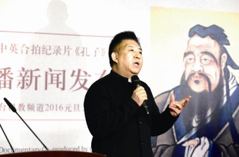 12月28日,中英联合摄制的纪录片《孔子》国际版首播新闻发布会在京举行。时长90分钟的纪录片《孔子》将于2016年1月1日21:00在中央电视台科教频道首播,1月2日14:00重播。图为纪录片《孔子》总编导闫东介绍情况。