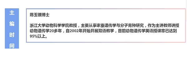 动物遗传学是第一批列入浙江大学双语教学建设的课程之一。作为课程建设的重要内容之一,就是教材建设。