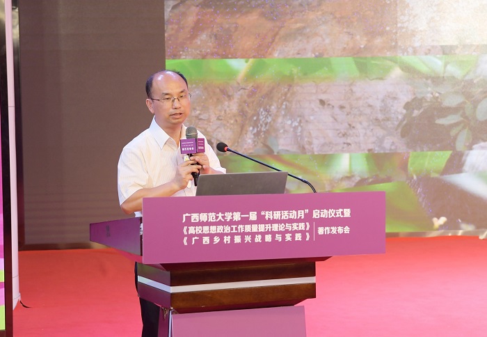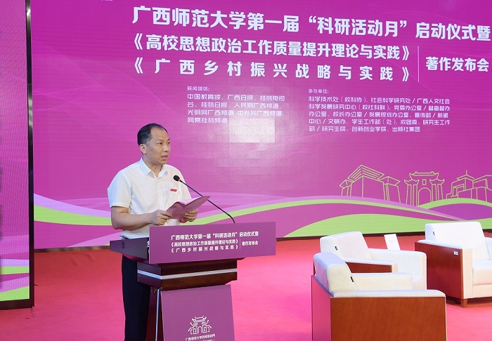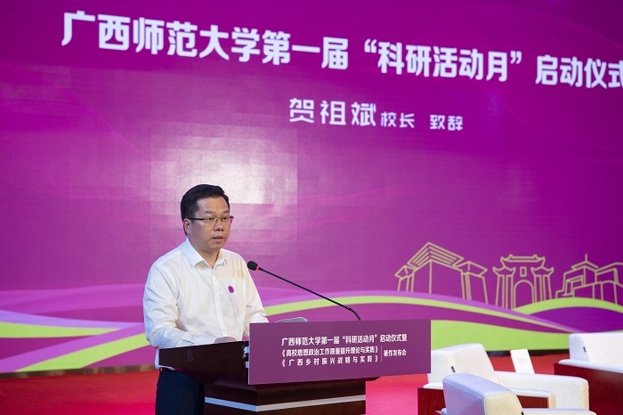 启动仪式现场,广西师范大学校长贺祖斌首先致辞,他代表学校向本次启动仪式及著作发布会表示热烈祝贺,并表示希望通过本次首届“科研活动月”打造系列科研品牌活动,着力提升全校师生的科学素养,营造创新创造的氛围,实现科研创新和“三全育人”的互相促进、共同发展。