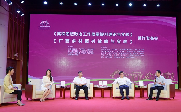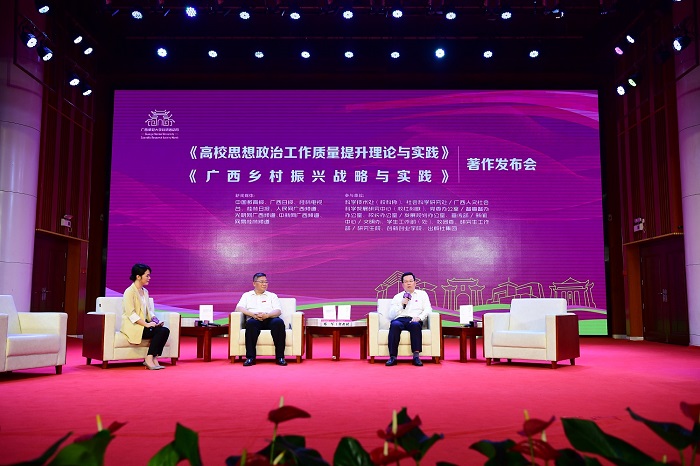 启动仪式后,《高校思想政治工作质量提升理论与实践》《广西乡村振兴战略与实践》著作发布会正式开始。邓军教授与贺祖斌教授分别就《高校思想政治工作质量提升理论与实践》与《广西乡村振兴战略与实践》这两套书的编写工作与在场人员进行了交流分享。作为《高校思想政治工作质量提升理论与实践》的领衔作者,邓军教授对该书做了详细介绍,他表示,该书的出版,体现了广西师范大学高度的政治站位与思想自觉、政治自觉和行动自觉,全面深刻总结了广西师范大学在党的十八大以来的实践探索的成果和丰富生动的实践案例,对于推动高校思想政治工作创新发展,都具有重要的理论价值和现实意义与参考价值。访谈中,邓军教授还提供了新形势下高校思想政治工作质量提升的方向与建议和广西师范大学接下来深入推进“三全育人”长效机制建设的计划与举措。贺祖斌教授针对《广西乡村振兴战略与实践》编撰意义与价值进行了分享,并分析了广西乡村振兴仍需迫切解决的问题。针对广西师范大学接下来如何更好地发挥高校功能,为广西乡村教育做出贡献,贺祖斌教授从成立“新农村发展研究院”与服务乡村教育振兴等方面进行阐释,并围绕乡村教师培养、加强农村教育研究、脱贫攻坚培训、科技扶贫、教育扶贫以及生态文明建设等方面进行了具体解答。