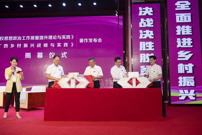 邓军书记、贺祖斌校长以及广西师范大学出版社集团党委书记、董事长黄轩庄、副总裁施东毅为两套著作发布揭幕(李显杨 摄)