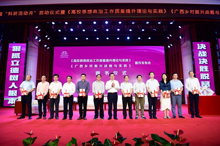 5月12日下午,广西师范大学第一届“科研活动月”启动仪式暨《高校思想政治工作质量提升理论与实践》《广西乡村振兴战略与实践》著作发布会在广西师范大学雁山校区音乐学院三楼综合厅举行。广西师范大学主要领导、学校各学院(部)代表、广西师范大学出版社集团主要领导、桂林部分高校图书馆负责人以及读者代表等出席了本次启动仪式暨著作发布会。现场举行了启动仪式、新书发布会、疫情防控应急科普报告会等活动。