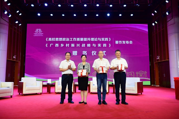 在发布会上,广西师范大学马克思主义学院副教授、浙江在站博士后钟慧容和广西师范大学教育学部教师欧阳修俊分别就《高校思想政治工作质量提升理论与实践》与《广西乡村振兴战略与实践》的出版价值与意义、推广价值以及阅读收获等话题进行了交流分享。随后,邓军、贺祖斌以及广西师范大学出版社集团党委书记、董事长黄轩庄,副总裁施东毅共同为两套著作发布揭幕,并向广西师范大学各学院(部)、各单位代表以及广西师大图书馆、桂林理工大学图书馆、桂林旅游学院图书馆赠送了新书。