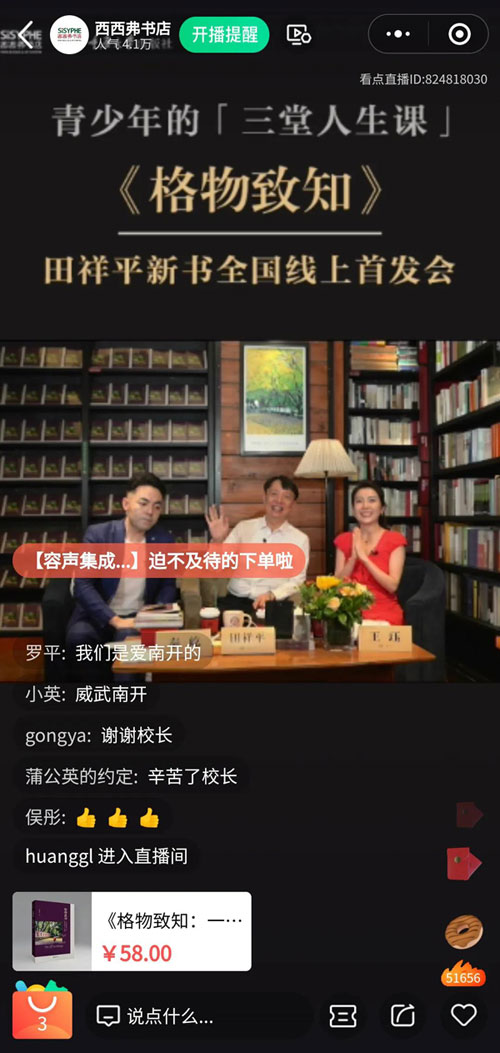 昨晚9时,田祥平校长带着新书《格物致知:一位中学校长给青少年的三门人生课》走进西西弗书店网络直播间,在线上进行了全国云首发。