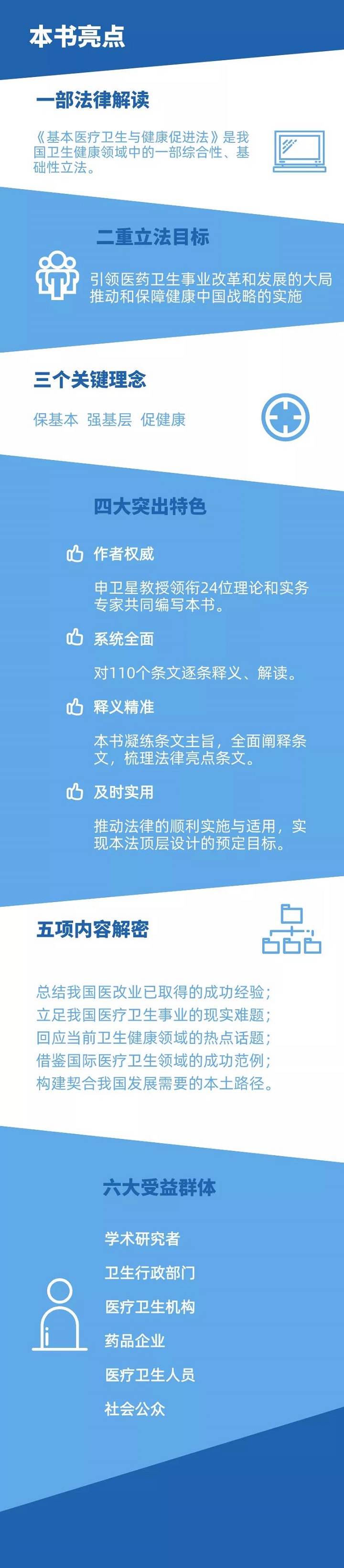 《中华人民共和国基本医疗卫生与健康促进法》理解与适用 作者:申卫星 主编 ISBN:978-7-5620-8002-2 定价:68元 中国政法大学出版社2020年6月