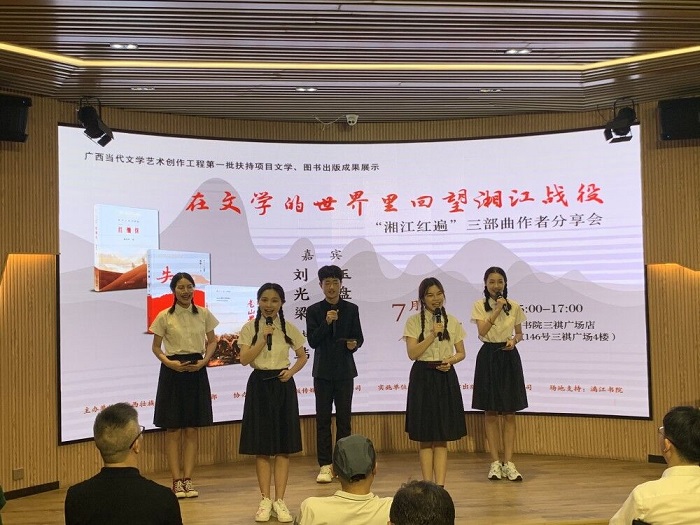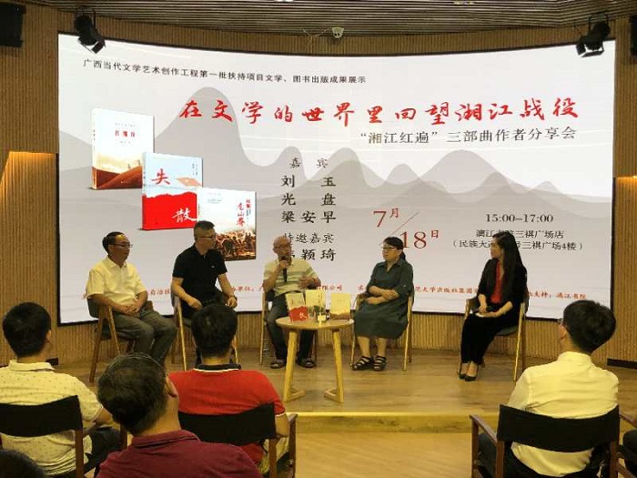 7月18日下午,在文学的世界里回望湘江战役——“湘江红遍”三部曲读者分享会在漓江书院三祺广场店举行。活动由自治区党委宣传部主办、广西出版传媒集团协办、广西师范大学出版社和漓江书院具体实施,是广西当代文学艺术创作工程第一批扶持项目成果展示活动中的一场。
