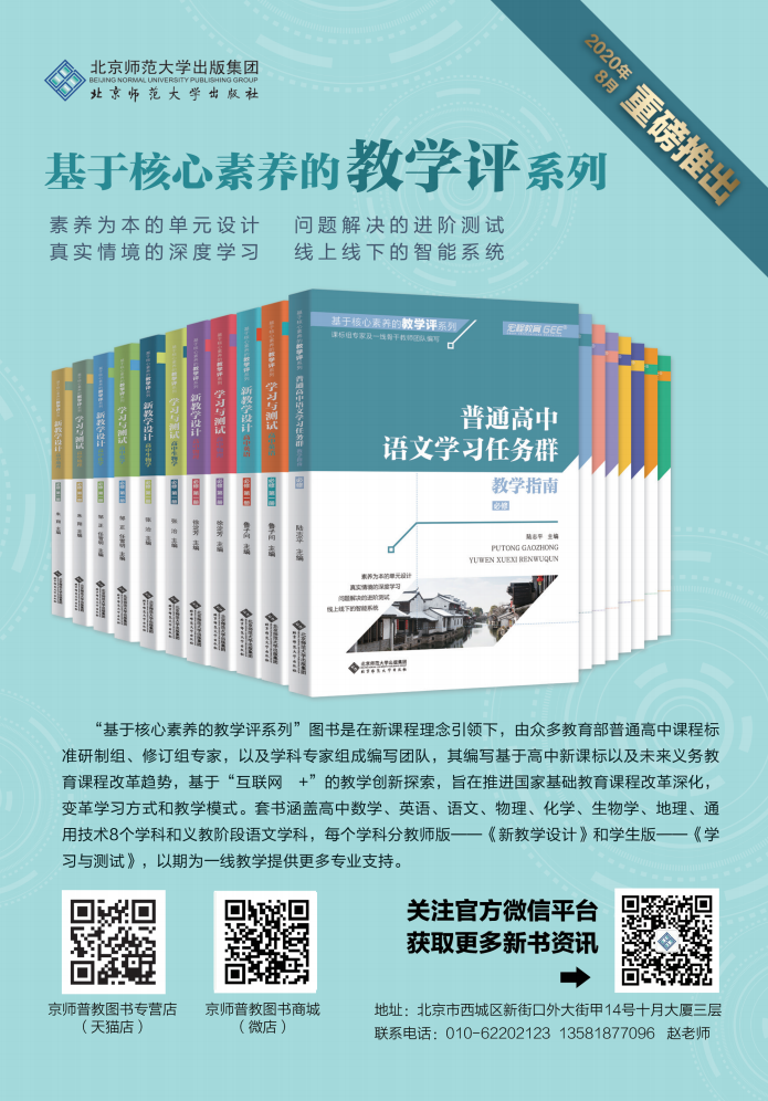 由该教研团队研发打磨形成的这样一套理论研究和实际操练相结合的重磅成果——《基于核心素养的教学评系列》图书,近日由北京师范大学出版社出版。围绕图书还设计了交互式教学平台和在线研修平台,是目前国内唯一由权威专家研发、体系完整、能够提供核心素养“教学评”一致性的整体解决方案。