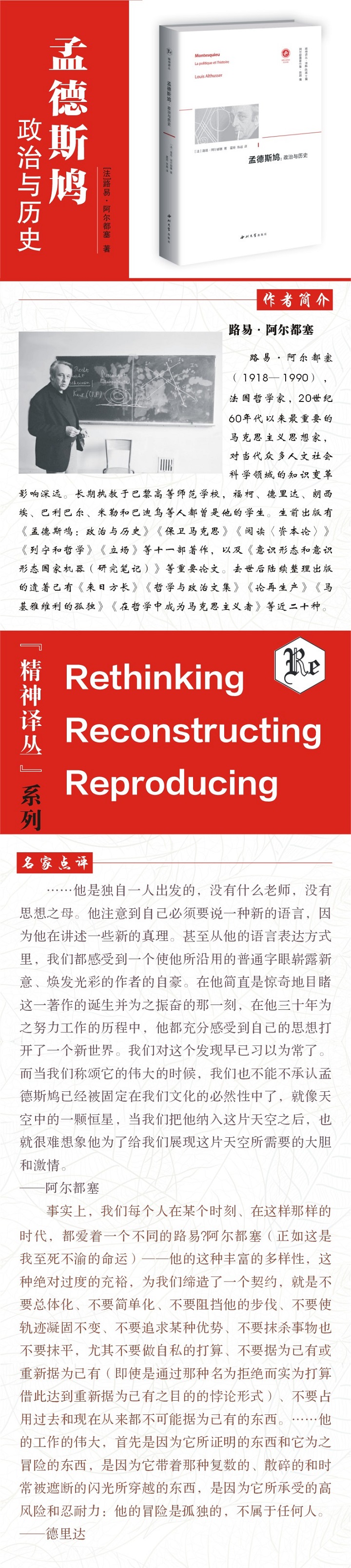 《孟德斯鸠:政治与历史》是二十世纪后半叶最具影响力的马克思主义哲学家路易·阿尔都塞生前出版的第一部著作,也是他的第一部代表作,是他进入理论成熟过程的里程碑。它不仅以精微深刻的阐释成为研究孟德斯鸠和现代政治科学诞生的一部经典,而且也包含着贯穿作者毕生思想的众多主题的开端。