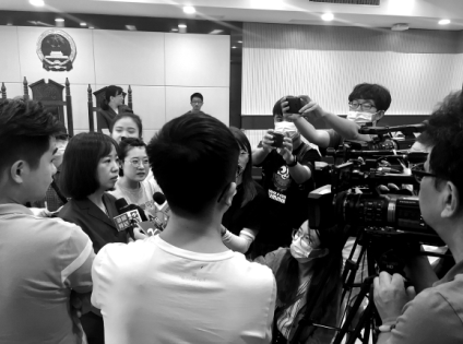 杭州互联网法院互联网审判第二庭审判员、法官张翀(左二)接受记者采访。