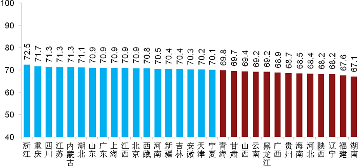 2.如下18个省/自治区/直辖市的得分在平均分及以上,包括:浙江(72.5分)、重庆(71.7分)、四川(71.3分)、江苏(71.3分)、内蒙古(71.3分) 、湖北(71.1分)、山东(70.9分)、广东(70.9分)、上海(70.9分)、江西(70.9分)、北京(70.9分) 、西藏(70.8分)、河南(70.5分)、新疆(70.4分)、吉林(70.4分) 、安徽(70.3分)、天津(70.2分)、宁夏(70.1分),其余13个省/自治区/直辖市的得分均在平均分(70.0分)以下。