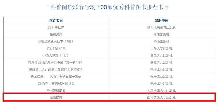 2020年9月,中国科普作家协会以2020年全国科普日活动为契机,组织开展了“全民科普阅读联合行动”。活动开展以来,数十家出版社积极推荐优秀科普图书。西南交通大学出版社出版的《高铁史话•高铁简史》一书,经专家遴选,成功入选中国科普作家协会公布的“科普联合活动”100部优秀科普图书推荐书目。  《高铁史话•高铁简史》高铁史话 胡启洲, 李香红, 曲思源, 编著