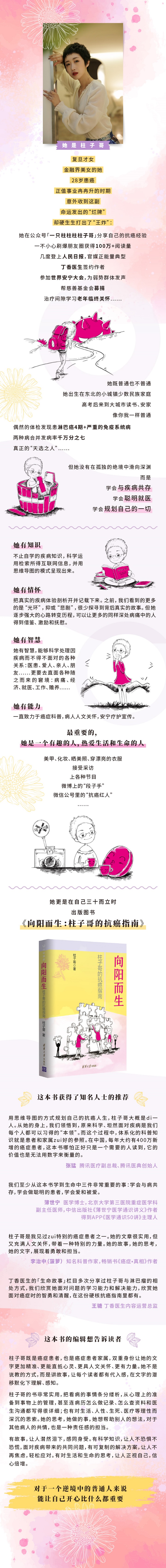 但这本书并不仅仅是抗癌指南,作为同时患两种重大疾病的弱女子,柱子哥现身说法告诉你,我们习以为常的生活、工作、理想、人生中什么是最重要的,什么是最值得呵护的……她的文字里没有哀伤和愤怒,只有力量、希望和对生活生命的思考。
