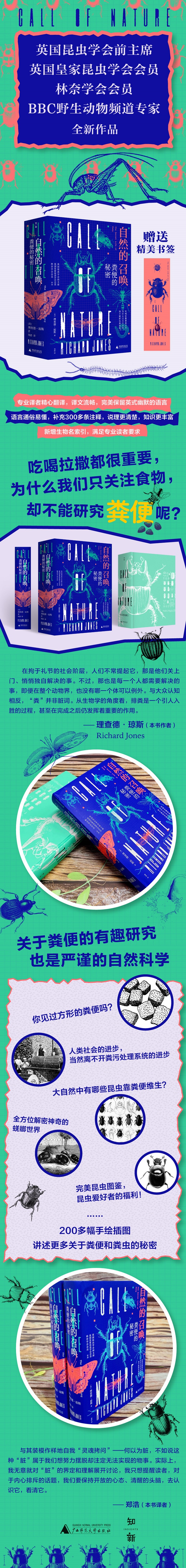《自然的召唤:粪便的秘密》 作者:[英]理查德·琼斯 译 郑浩出版社:广西师范大学出版社出版时间:2020年11月 内容简介 毫无疑问,人类和动物都要排泄。粪便产生之后发生了什么,去了哪里,如何消失,这些问题尤为重要,我们却常常选择回避。在城市中,粪便被轻松地冲入下水道,等待它们的是复杂的处理过程。在大自然中,动物粪便刚一落地,大量粪食性昆虫就开始了一场争分夺秒的竞赛,抢夺这宝贵的食物。从蜣螂到蚊蝇,粪便成了觅食、筑巢、繁殖的场所,构成了一个奇妙的微型生态系统。