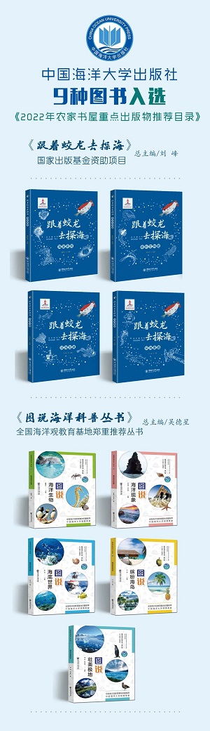 中国海洋大学出版社此次共有9种图书入选图书推荐目录,其中科技类图书4种,分别是《跟着蛟龙去探海·奇妙生物圈》、《跟着蛟龙去探海·海底奇观》、《跟着蛟龙去探海·探海重器》、《跟着蛟龙去探海·深海宝藏》;少儿类图书5种,分别是《图说海洋现象》、《图说海洋生物》、《图说海底世界》、《图说缤纷海岛》、《图说壮美极地》。这9种图书都是海洋科普领域的精品佳作。