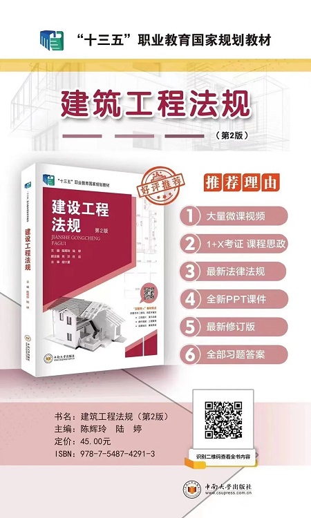 鉴于此,编写组对全书进行了修订,改正了原书中不合理的地方,删除了原书中冗余的内容,同时增补了最新的法律法规、政策规范及建设行业前沿信息,如《中华人民共和国建筑法》(2019年修正),《中华人民共和城乡规划法》(2019年修正),《中华人民共和国土地管理法》(2019年修正),《中华人民共和国招标投标法》,并以二维码的形式在重点章节增加了微课、学习素材、习题训练等。(附《教材修订内容对照表》)