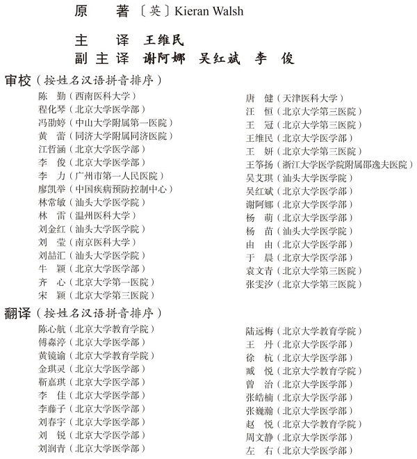 本书的翻译是我们共同学习和提升的过程。本书初译以北京大学医学教育学科的研究生及北京大学医学英语专业的高年级本科生和研究生为主。初稿完成后,全国医学教育发展中心邀请了活跃在我国医学教育研究领域的专家学者参加审校,保证本书在质量上忠实于原著。特别感谢学生们的付出,感谢专家们的支持。
