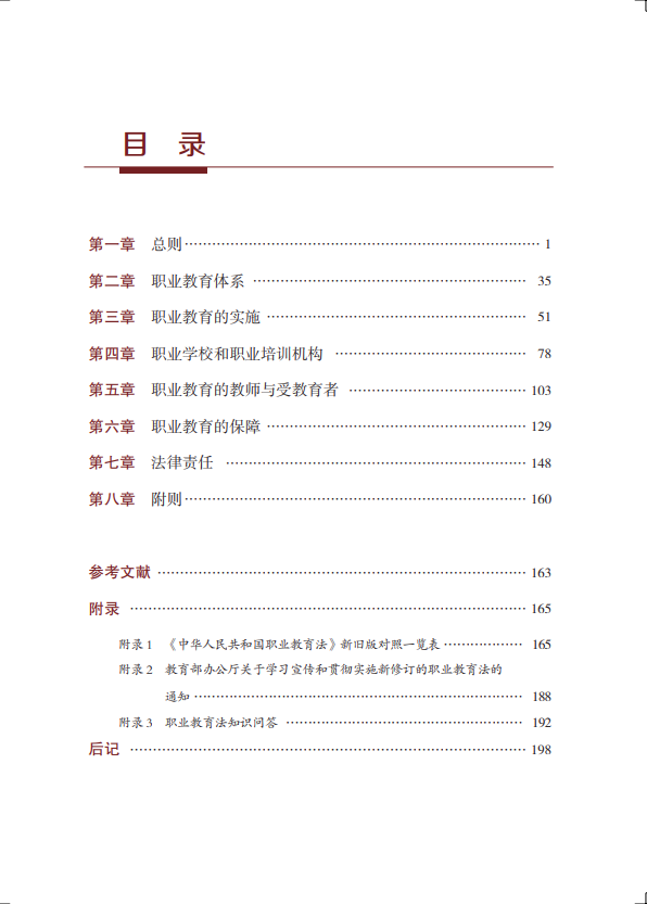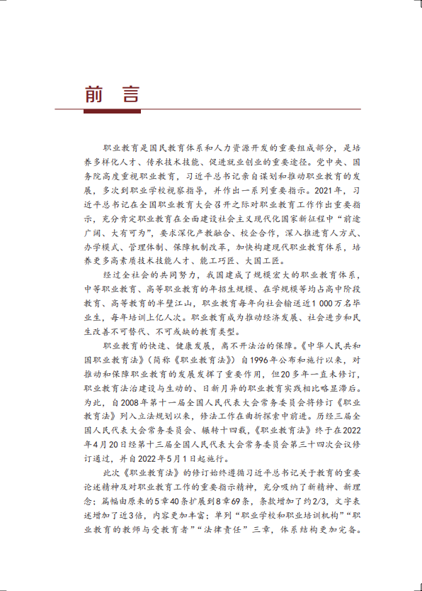 本书采用双色印刷,对新旧《职业教育法》进行了比较,使读者能够更直观地了解新旧《职业教育法》的区别。同时,每个章节均设计了“学习感悟”专栏,方便读者随时记录和翻阅。
