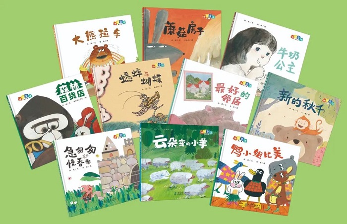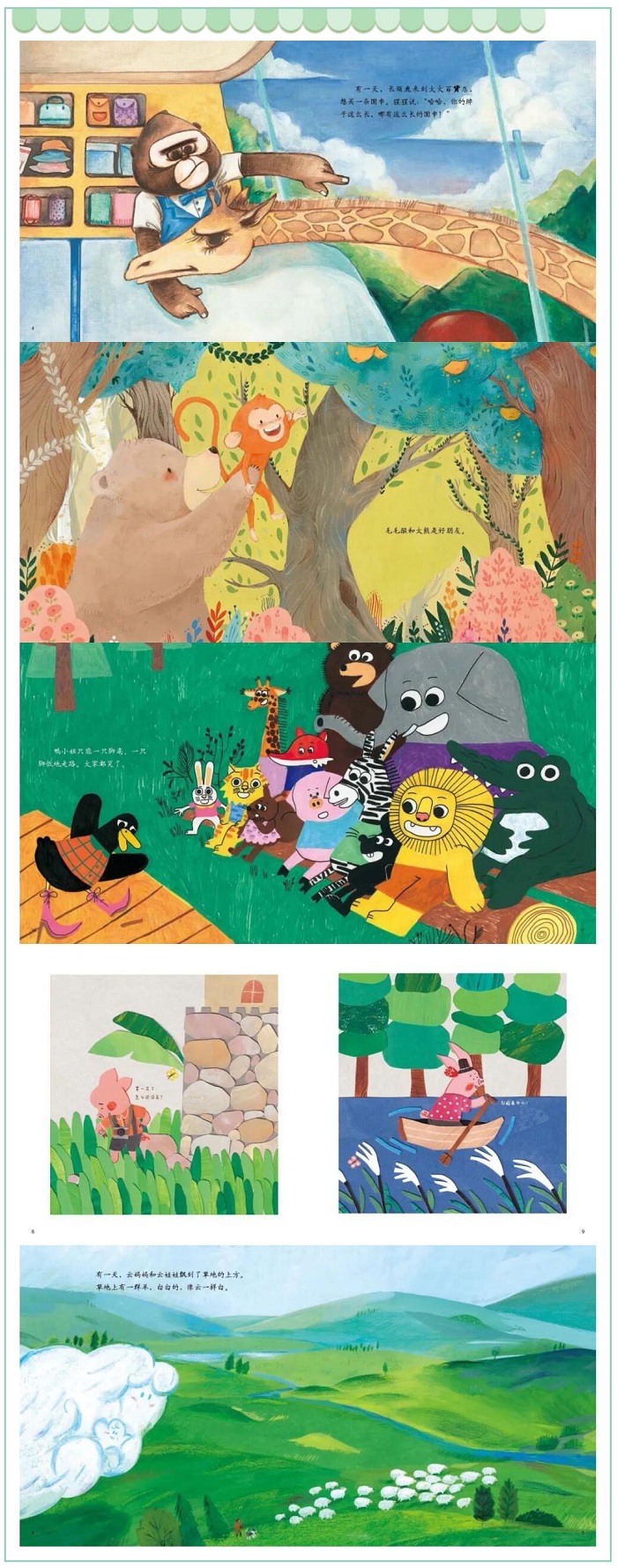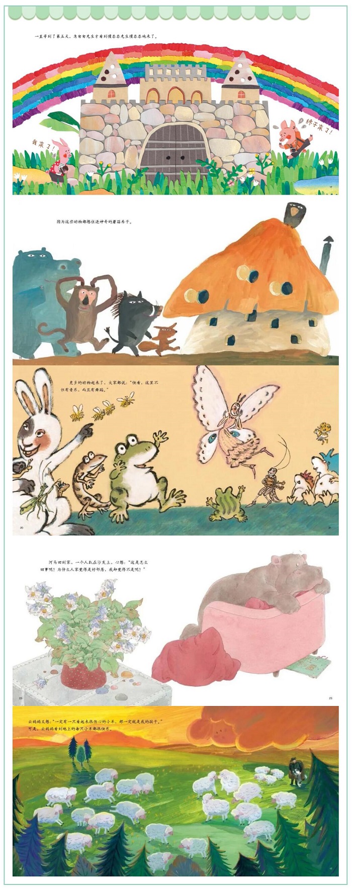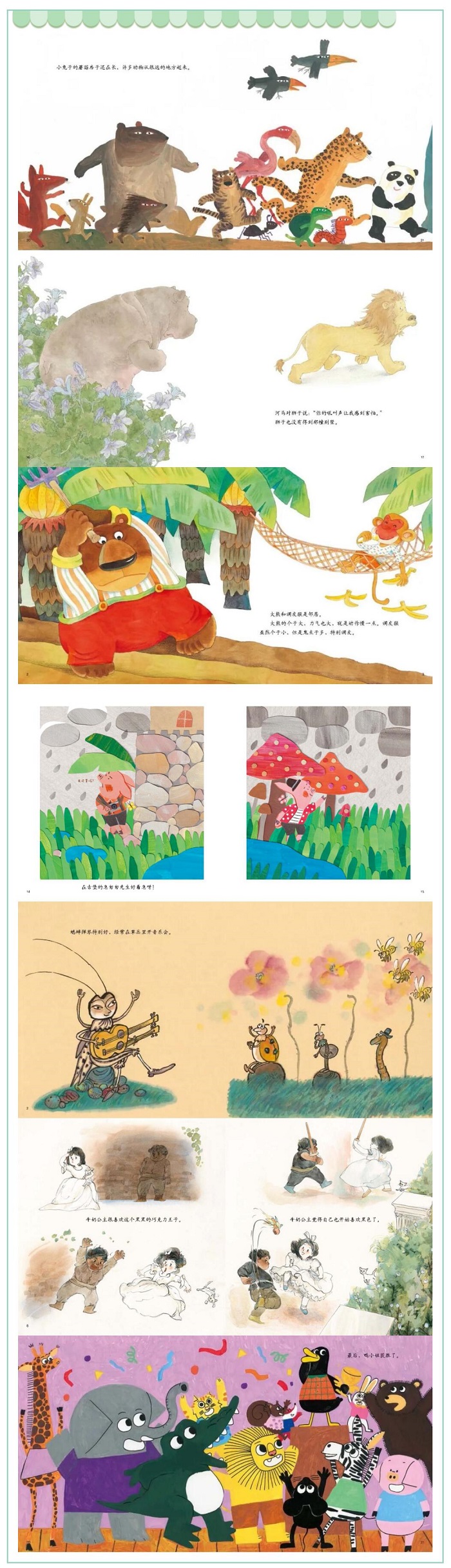 绘画各具特色——剪纸拼贴风格的《急匆匆和慢吞吞》、油画大笔触风格的《蘑菇房子》、国画水墨写意风格的《蟋蟀与蝴蝶》、水彩细腻画风的《最好的邻居》、丙烯风格的《云朵变的小羊》……从这些画面中,孩子们既能够欣赏到不同的绘画风格,开启对不同艺术形式的认知,感受到艺术表达的多样性,受到美的熏陶,又能够在画面中感受到童话故事的趣味性。