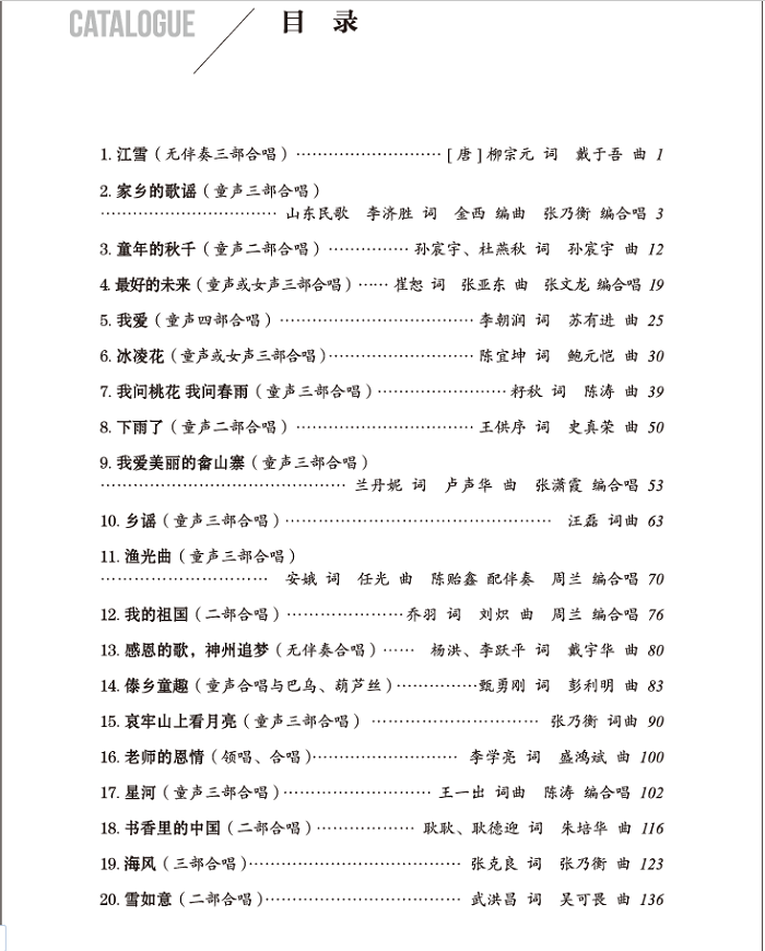 《唱·响中国——校园合唱作品新编(小学)》收录了20首具有鲜明艺术特色、符合小学阶段学生演唱的合唱作品。如根据经典歌曲改编的童声合唱《渔光曲》《我的祖国》;根据古诗词编配的无伴奏三部合唱《江雪》;富有童真童趣和少数民族音乐特色的童声合唱《傣乡童趣》;饱含深情,韵味悠长的童声三部合唱《家乡的歌谣》;旋律清新流畅,用音乐体现阅读之美的二部合唱《书香里的中国》等。
