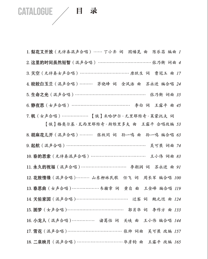 《唱·响中国——校园合唱作品新编(中学)》收录了18首具有鲜明艺术特色、符合中学阶段学生演唱的合唱作品。如表达对家乡的赞美、思念之情的无伴奏混声合唱《梨花又开放》;以小提琴、中提琴、钢琴伴奏,旋律宽广明亮的混声合唱《生命之光》;以春天比喻希望,积极向上,富有朝气的无伴奏混声合唱《春的思索》;以山东柳林民歌为基础进行编创,富有民族风韵的混声合唱《花鼓情缘》等。
