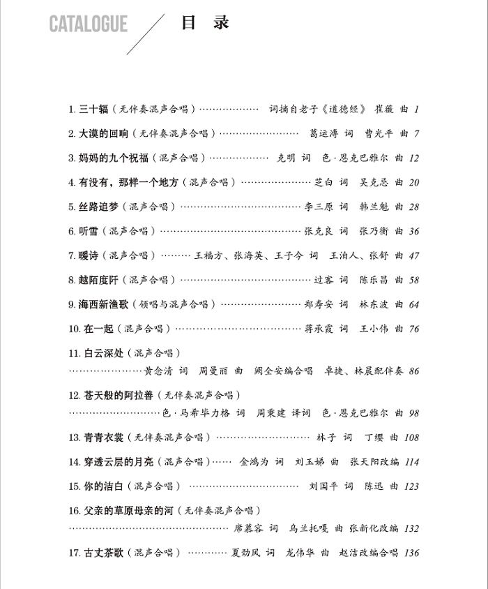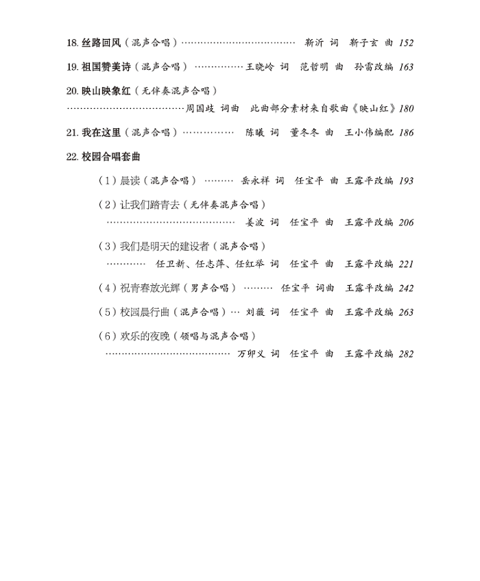 《唱·响中国——校园合唱作品新编(大学)》收录了27首具有鲜明艺术特色、符合大学阶段学生演唱的合唱作品。如歌词摘自老子《道德经》的无伴奏混声合唱《三十辐》;意境深远,悠扬广阔,展现新时代新丝路的恢弘气象的无伴奏混声合唱《大漠的回响》;以及由《晨读》《让我们踏青去》等6首洋溢着青春朝气的合唱作品组成的《校园合唱套曲》等。