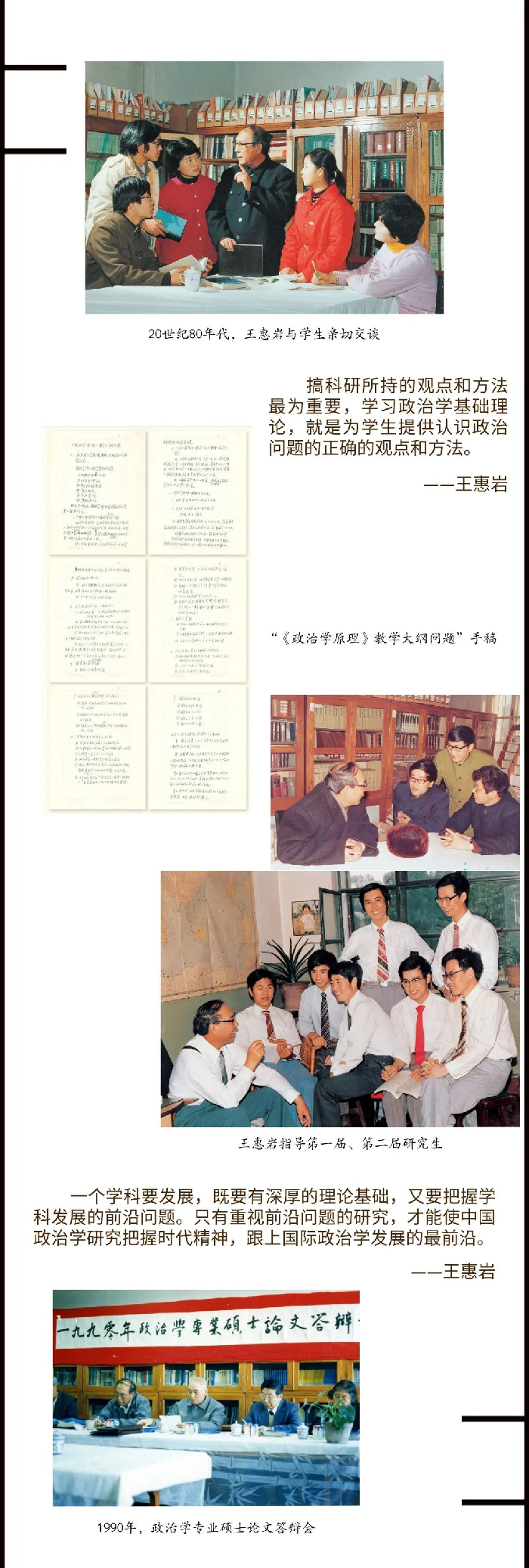王惠岩先生指导研究生可以用呕心沥血来形容,从论文题目的提出到论文理论研究框架的确立,他都严肃地提出意见,每一篇论文都逐字逐句地仔细修改,经典引用不准确、错别字等都逃不过他的眼睛,而且要求论文必须字迹工整,全篇论文不许有任何的涂抹。他曾经将不合格的硕士论文当场撕掉,让学生空着两只手回去重写……因此,弟子们有一个共同的感觉就是“怕”老师,即便毕业多年,事业有成的学生也依然如此,这是发自内心的敬畏。从1985年开始,政治学系开始招收政治学研究生班,王惠岩先生每年都要指导20多篇硕士论文,工作量之大,难以想象。这需要他有超常的精力,他在60岁之前,很少在深夜两点之前休息。