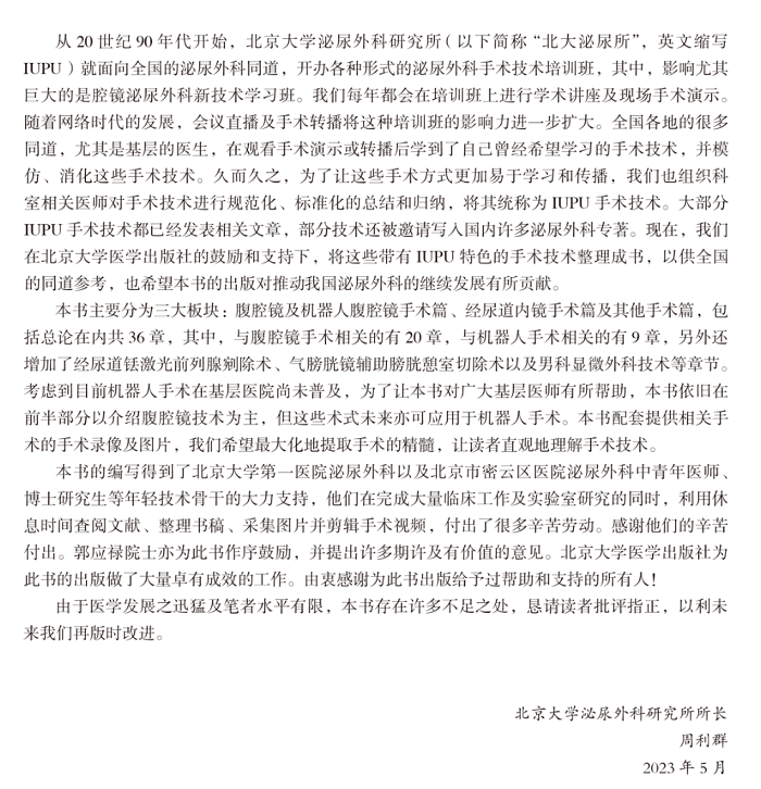 为了使技术的发展能够惠及更多同行与患者,北大泌尿所的专家们将这些具有北大泌尿所特色的技术进行了整理与汇编,形成这部《泌尿外科微创技术创新与改良——北大泌尿所(IUPU)技术》,同时附上手术视频,希望本书的出版对推动我国泌尿外科的技术发展有所贡献。