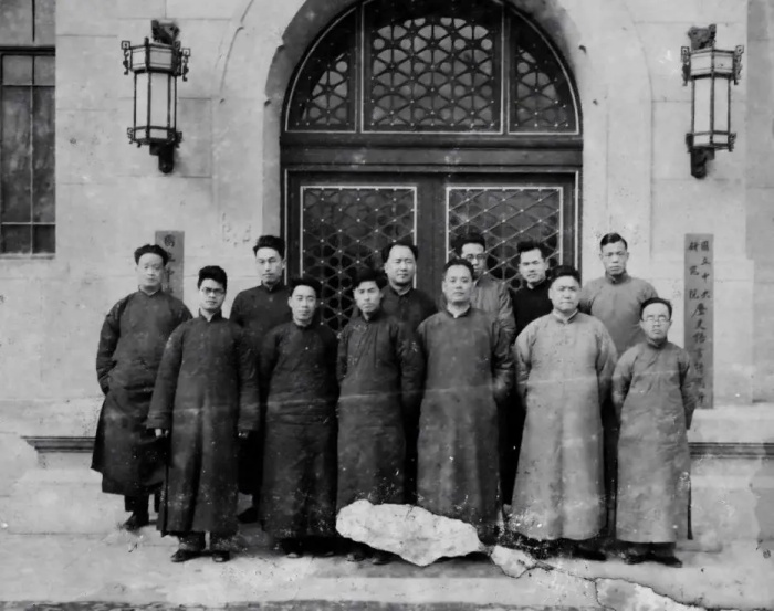 史语所考古组在南京所址前合影 后排左起:董作宾、梁思永、李济、李光宇、胡厚宣、高去寻 前排左起:王湘、石璋如、刘耀、郭宝钧、李景聃、祁延霈