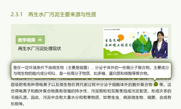 数字教材《生态文明与环境工程实习教程》由北京航空航天大学孙也教学团队原创编写,融合文字、气泡注解、慕课视频、现场视频、工艺流程图、实物图、原理动画、虚拟仿真拆装动画等元素,为生态文明实践教学提供新思路。教材利用先进的数字技术优势,将高校生态文明教育搬进生态与环境保护实践现场,为学生提供了纵览大局、虚实结合、透视内部、身临其境的沉浸式实习新感受,帮助大学生牢固树立生态文明意识。