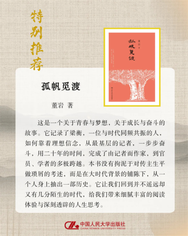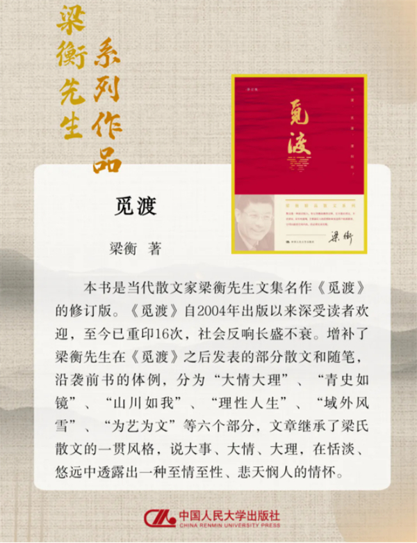30年来,“觅渡”的精神从未停止传承。2023年,改编自该文的同名电影上映,获第20届华表奖优秀故事片奖,让“觅渡”精神以更鲜活的影像形式走进读者心中;而《觅渡》一书作为原文最本真、最完整的呈现载体,依然是青少年研读经典、汲取力量的核心选择,其承载的教育价值与精神内涵,在新时代依然焕发着蓬勃生机。中国人民大学出版社出版的《觅渡》《洗尘》《重阳》三部曲,一脉相承,完美诠释了梁衡“大事、大情、大理”的创作核心。读者可以在梁衡先生的文字中,可以感受自然之美、历史之深,在经典的滋养中找到自己的成长方向,逐光而行、不负韶华。