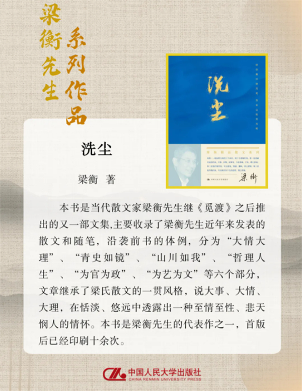 自1982年《晋祠》初次入选教材至今,梁衡先生有60多篇次文章先后入选大、中、小学教材,是作品入选教材最多的作家之一。可以说,当今中国,从9岁到50岁的群体中,许多人都曾学习过梁老师的文章,不少人的人生轨迹,也因这些文字而悄然改变。多年来,《觅渡》一书一直是中国人民大学附属中学高中部等多所名校历年必读书目,陪伴了一届又一届青年成长,成为他们青春路上的“精神灯塔”。《觅渡》与其后出版的《洗尘》《重阳》共同组成了梁衡散文作品三部曲,集中展现了其散文创作的思想高度与艺术水准。