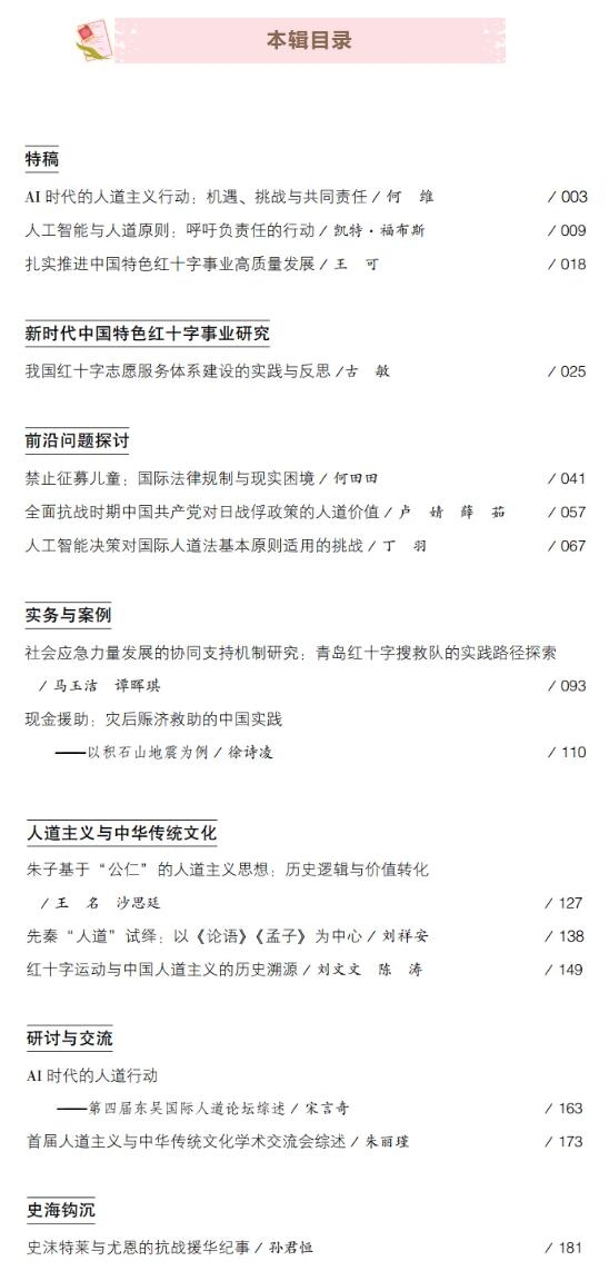 本辑各栏目内容丰富多元,既有对中国红十字志愿服务、应急救援等本土实践的深度探讨,也有对国际人道法前沿、人道主义与中华优秀传统文化融合的深入研究,更有对人道历史的追溯与学术交流成果的呈现,稿件兼具理论深度与现实观照。