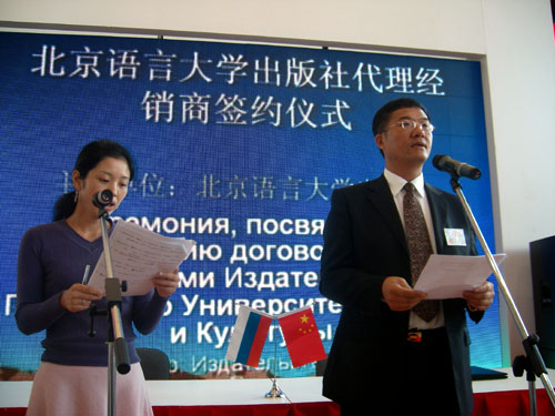 2007年9月6日,北京语言大学出版社《感知中国—中国文化百题》音像精品发布会暨合作协议签订仪式在莫斯科国际展览中心成功召开。国家新闻出版总署图书司司长吴尚之,国际交流司副司长陈英明,我校副校长韩经太等领导应邀出席了发布会。大会由我北京语言大学出版社副社长陈波主持。