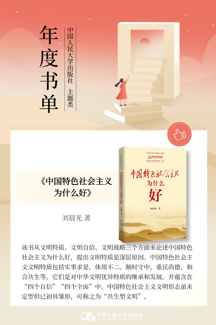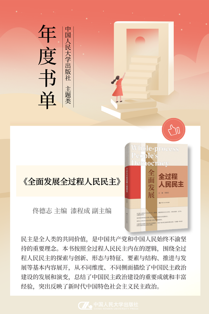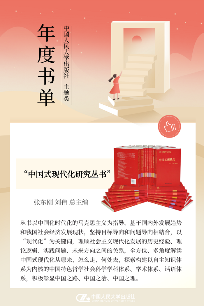 本次分享中国人民大学出版社2022年“主题出版”年度书单,本书单包含24种图书,分别是“中国式现代化研究丛书”、《中国特色社会主义为什么好》、《中华文化为什么兴》、《何以制胜?——中国共产党的成功之道》、《全面发展全过程人民民主》、《新民主主义革命口述史》、《中国话语体系的建构》、《对话中国教育:未来教育创新的建议》、《马克思经济思想与中国特色政治经济学》、《马克思主义政治经济学的发展与创新》、 《探索马克思主义哲学的当代形态》、《新时代改革方法论研究》、《马克思哲学变革的当代阐明》、《学科、学术与话语:中国马克思主义哲学社会科学体系建构研究(1919—1949)(上、下卷)》、《认识的本质与机制》、《马克思主义信仰研究》、《改革开放新转折》、《中国社会建设现代化之路》、《北京冬奥会和冬残奥会志愿者读本》、“新时代马克思主义教育理论创新与发展研究丛书”、《读懂党内法规》、《土地制度与中国发展(增订本)》、《县乡中国:县域治理现代化》、《江山与人民:中国治理体系解析》。
