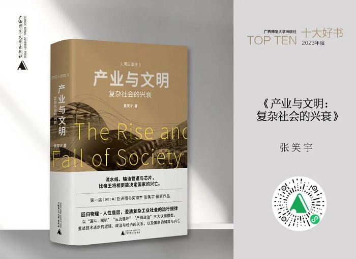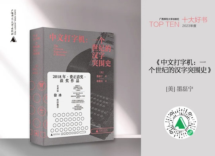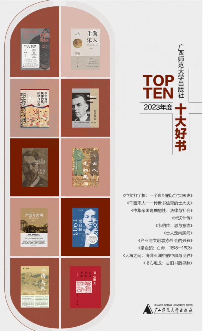 广西师范大学出版社2023年度十大好书,分别是:《中文打字机:一个世纪的汉字突围史》《千面宋人——传世书信里的士大夫》《中华帝国晚期的性、法律与社会》《米沃什传》《韦伯传:思与意志》《士人走向民间:宋元变革与社会转型》《产业与文明:复杂社会的兴衰》《梁启超:亡命,1898—1903》《人海之间:海洋亚洲中的中国与世界》《书心雕龙:古旧书版寻踪》。