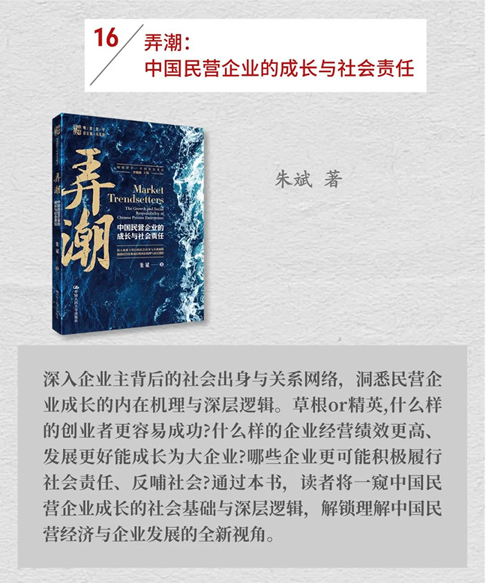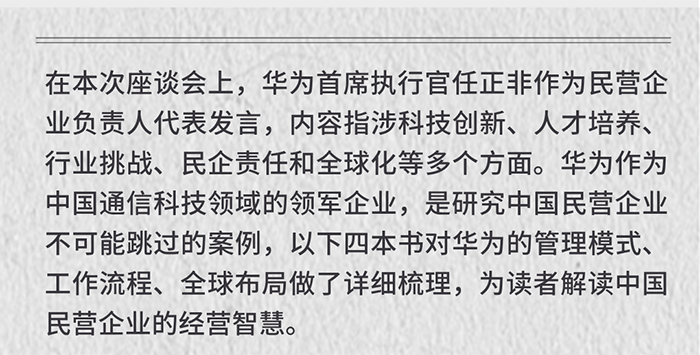 中国人民大学出版社推荐有关民营企业座谈会书单,包括24本图书:《新质生产力:理论、事实与路径》《新质生产力的政治经济学》《科技创新与新质生产力》《中国新经济:创新与规则》《潮起:中国创新型企业的诞生》《大变局下的中国管理2:专精特新之路》《赢在组织》《终局思维》《新出海:中企海外本土化实战手册》《全球竞争力培育》《组队》《企业家精神——商业与社会变革的核能》《社会企业家精神》《社会企业家精神(第二辑)》《创业中国故事》《弄潮:中国民营企业的成长与社会责任》《失衡与重塑——百年变局下的中国与世界经济》《中国道路的政治经济学》《华为规模营销法》《华为三十年——从中国出发的全球化》《华为战略管理法》《华为定价法》《数字经济与数字化转型》《零售供应链数字化创新》。