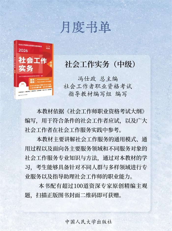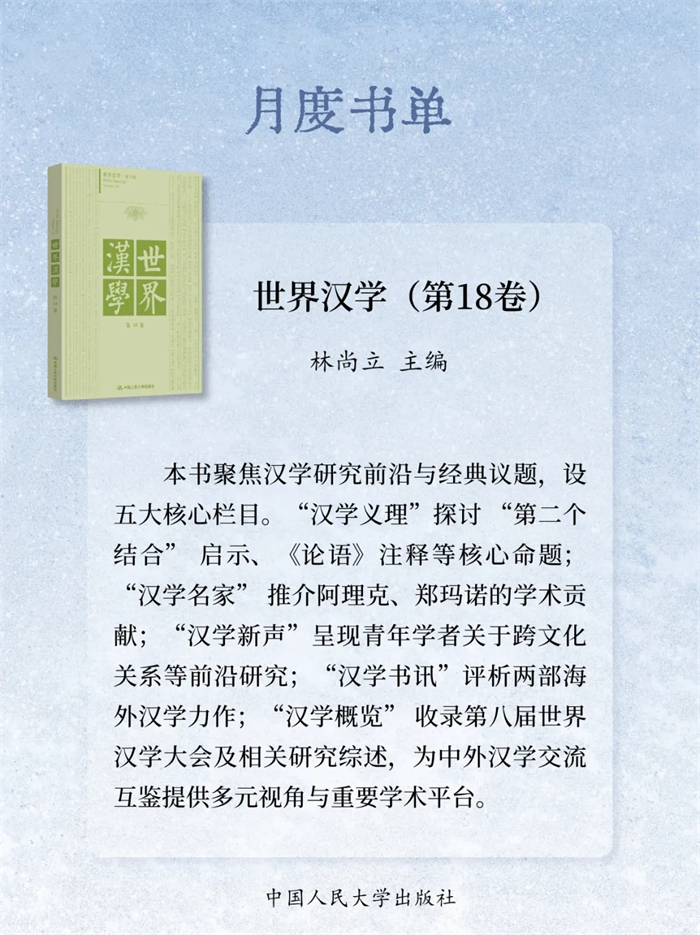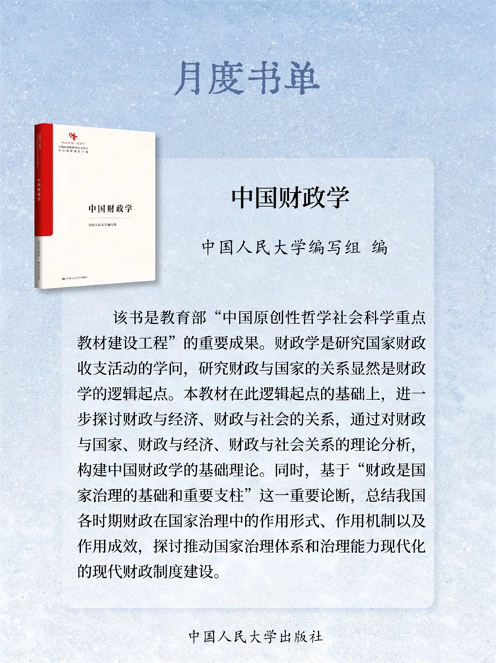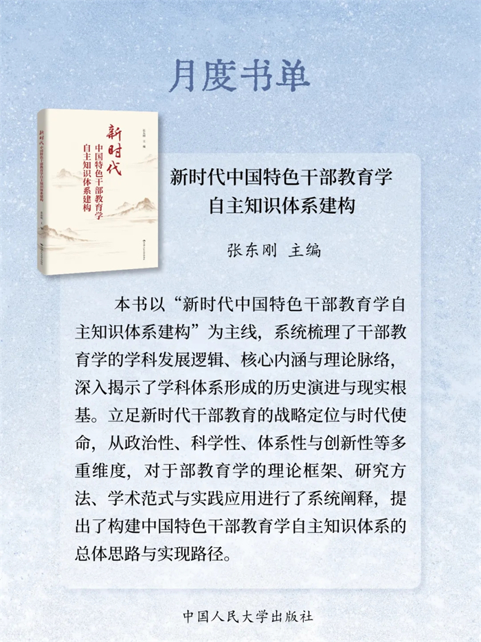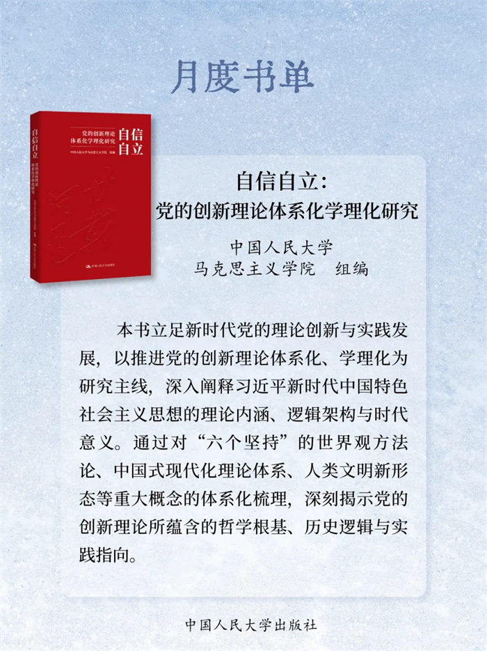 岁末将至,书页翻卷间藏着整年的沉淀与对未来的期许。2025年12月,中国人民大学出版社精选23本新书:《自信自立:党的创新理论体系化学理化研究》《守正创新:马克思主义理论学科学术研究》《启智润心:思想政治理论课教育教学研究》《百岁老人徐光耀眼中华北联大的精神力量》《乐黛云集》《中国财政学》《新时代中国特色干部教育学自主知识体系建构》《世界汉学(第18卷)》《世界政治史(三卷本)》《新时代中国特色教育系统干部培训体系建设》《干部教育培训体系的国别研究》《社会工作综合能力(初级)》《社会工作实务(初级)》《社会工作综合能力(中级)》《社会工作实务(中级)》《社会工作法规与政策(中级)》《社会工作实务(高级)》《康德的自由构想》《敦煌学概论(修订版)》《游牧民世界史:人类文明的另一个侧面》《烈焰玫瑰:巴塞罗那的自由与激情》《大国小农:城市化进程中的农民》《相亲:婚恋选择与新女性》,陪您一起迎新过冬!
