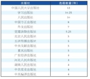 如表1所示,入选次数最多的前5家出版社为中国人民大学出版社、学习出版社、人民出版社、中国方正出版社、外文出版社,入选数量占总数近五分之一。平均每年1个以上选题入选的,即4年入选4个国家重点图书·主题出版规划选题的出版社有15家,选题数约占总数44.9%。