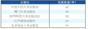 全国高校出版社主题出版选题由教育部自2014年开评,其中2016~2019年入选的主题出版选题共计663个,涉及80家出版机构,平均每家出版机构入选约8个选题。中国人民大学出版社、厦门大学出版社、陕西师范大学出版总社、江西高校出版社、北京师范大学出版社这5家出版社4年的入选数量都在30种以上,入选占总数近30%(见表3)。其中中国人民大学出版社入选选题数量为62种,占总数的近十分之一,也是唯一一家数量超过60种的出版社。