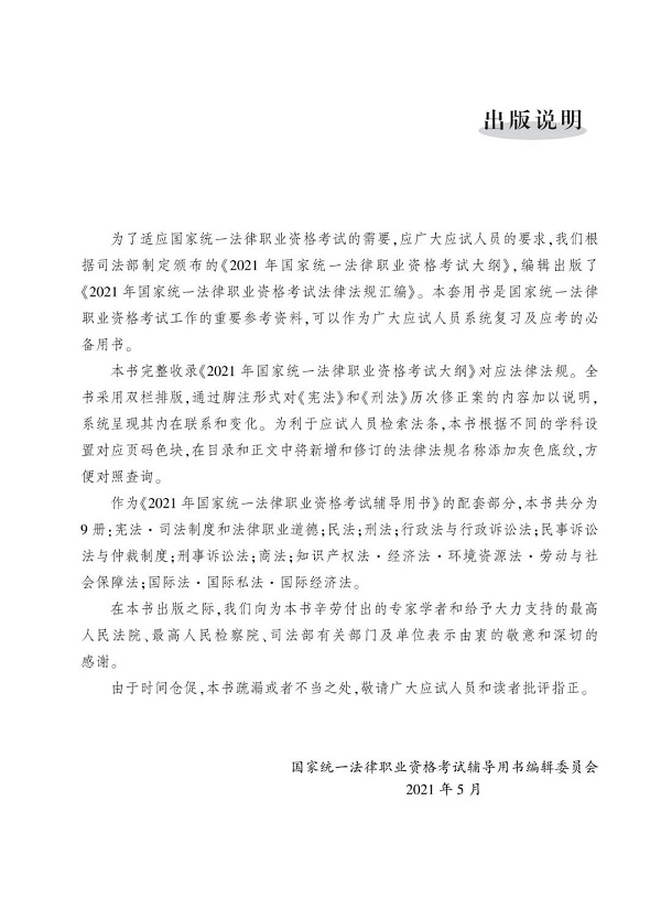 《2021年国家统一法律职业资格考试法律法规汇编》(订购) 国家统一法律职业资格考试辅导用书编辑委员会 编 ISBN:978-7-5620-9884-3 定价:220.00元(全9册) 中国政法大学出版社2021年5月