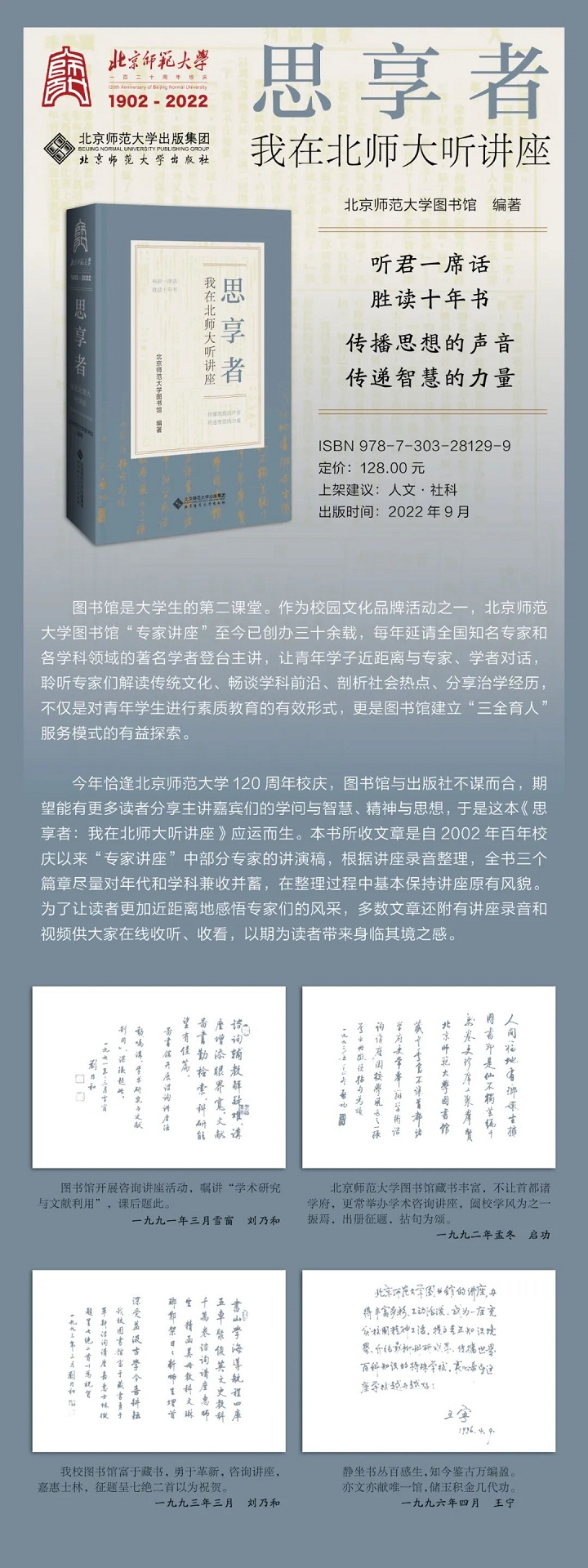 木铎金声,弦歌不辍;巍巍师大,历久弥新。2022年9月,正值北京师范大学120周年华诞和图书馆120周年馆庆,北京师范大学出版社特别出版了这卷《思享者:我在北师大听讲座》纪念专辑,精选近20年图书馆专家讲座之精华,与更多读者分享主讲嘉宾们的学问与智慧、精神与思想。