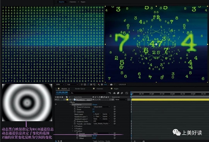 如何呈现“动态”,是我们重点探讨的部分。文中第四章讨论了节奏的控制,其中无限循环部分展示了魔幻的德罗斯特效应,时间和空间上距离甚远的艺术遥相呼应,在重复的现象之下,又暗含着一条连续演化的脉络。第五章将文字的运动结合图形的转换,我们将学会分解、聚散、嫁接、融合、渐变等结构方式变化,以及二维与三维空间的转换;第六章探索音乐旋律的视觉再现,视觉与音乐符号的转换也表达了设计师对数字信号、数据、代码的深刻反思。