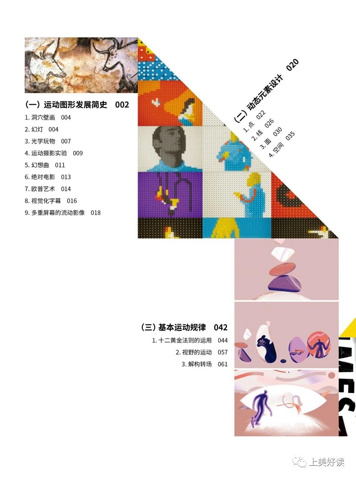 何时要“动态”?书中第一章带领我们一起凝望运动图形发展历程中几颗特别闪耀的星星;第二章动态元素分析帮助我们建立通往作品内在律动的桥梁;第三章剖析了基本运动规律,并解构了转场。阅读完这三章我们可以结合创作反思一下“动态”的时机。