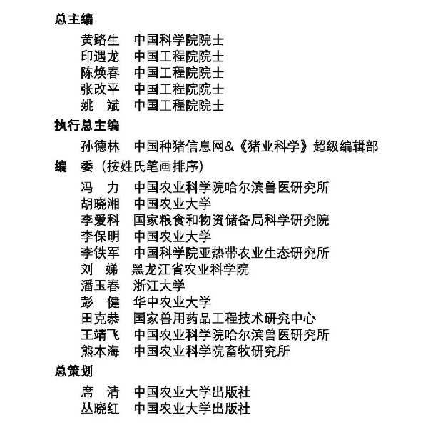 本系列丛书有四大亮点:第一,由中国科学院院士吴常信、中国工程院院士李德发两位院士联袂推荐并作序;第二,由中国科学院黄路生院士、中国工程院印遇龙院士、陈焕春院士、张改平院士、姚斌院士等5位院士共同牵头组织并担任丛书总主编,他们的高屋建瓴和深厚积淀使得丛书具有很强的权威性、前瞻性和引领性;第三,由11位年富力强的行业领军科学家担任各分册主编,他们大多获得过国家科技进步二等奖等奖项,所撰写内容具有鲜明的针对性、创新性和前沿性;第四,本系列丛书立足于服务党和国家工作大局、立足于建设农业强国这一宏伟目标,以科技创新性成果引领、驱动和支撑未来中国猪业的高效健康发展。