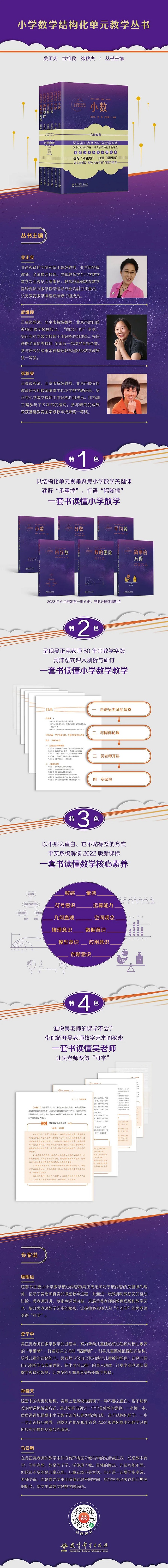 全套书由24本书组成,分批推出,涵盖了小学数学教学四大领域的24个关键内容,旨在帮助一线教师建立对小学数学教学的整体认知,使内容结构化,帮助学生打通知识概念之间的“隔断墙”,建好核心知识和核心素养的“承重墙”。