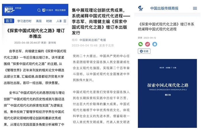 由首都经济贸易大学出版社出版的《探索中国式现代化之路》一书近日推出增订本。该书由李志军、尚增健主编,围绕 “探索中国式现代化之路”的主题, 从《管理世界》近年来刊发的相关论文中精选出28篇文章汇编而成。首印一经出版,很快售罄。