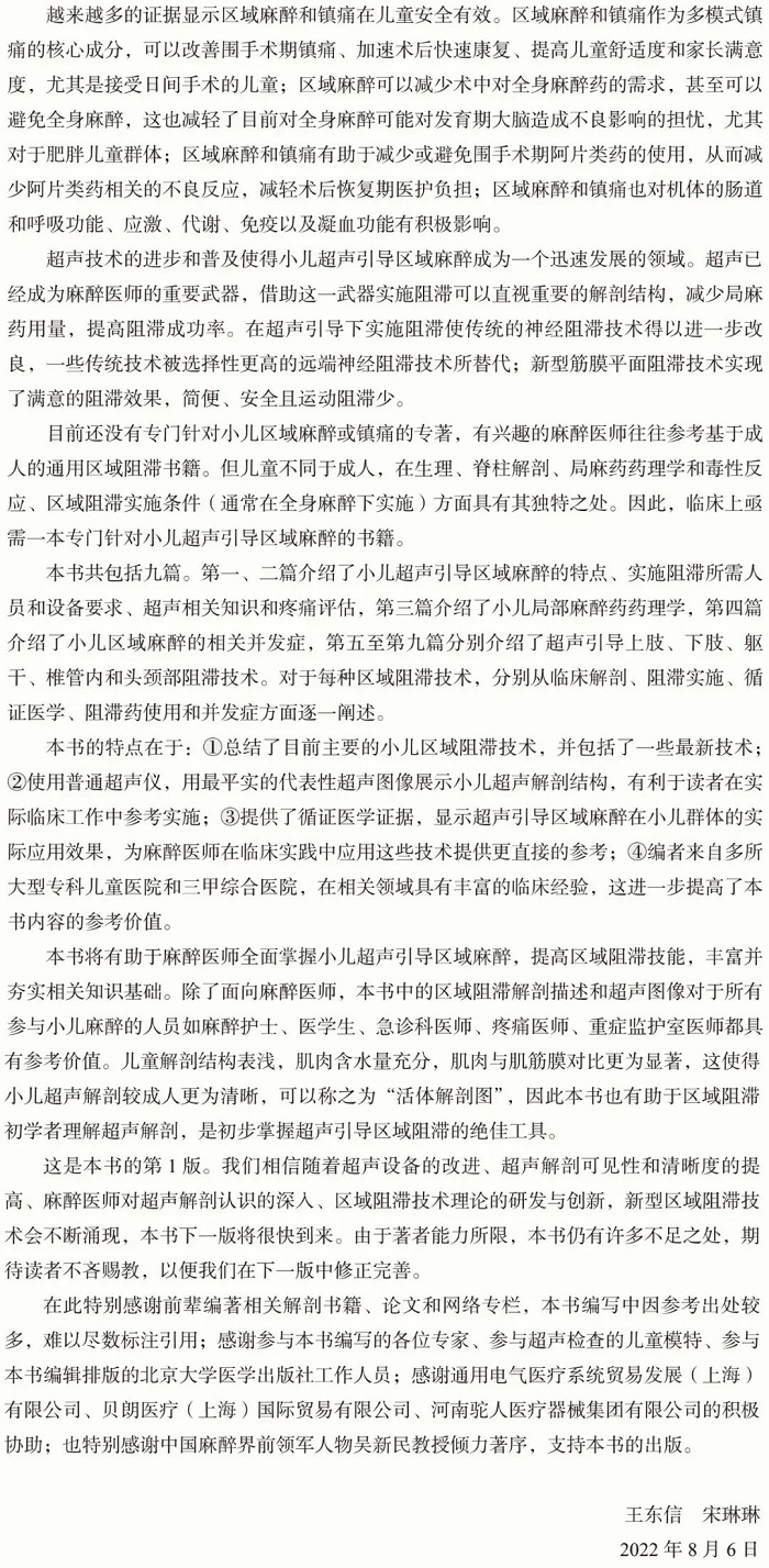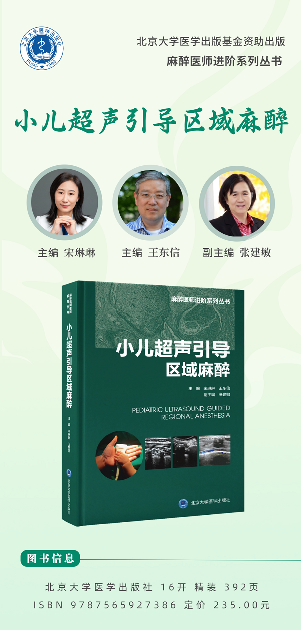 由宋琳琳、王东信、张建敏三位专家共同主编的麻醉学新著《小儿超声引导区域麻醉》已经由北京大学医学出版社出版,与各位读者见面了。本书对小儿超声引导区域麻醉进行了全面、系统、详细的介绍,涵盖小儿超声引导区域麻醉的特点、要求、评估,常用麻醉药物的药理学,临床常见并发症,并重点叙述了各区域的阻滞技术。本书具有以下特点:
