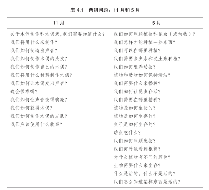 现在,请花点时间看一看表4.1中列出来的几组学生的问题,它们是由同一组学生提出的。请重点关注从11月到次年5月问题的深度和复杂性是如何演变的。另外,请注意,11月的问题是封闭式的,与项目的特定方面和材料的使用有关;而次年5月的问题则是开放式的,可以激发学生更深入的探究。