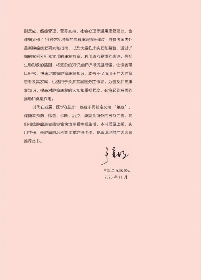 40年前骨癌的治疗经历让我刻骨铭心,规范治疗与康复管理都非常关键,我诚挚推荐这本科普图书给更多的癌症患者及其家属,便于学习、了解科学的肿瘤康复知识。