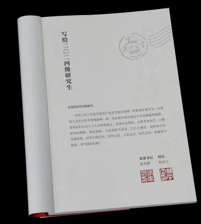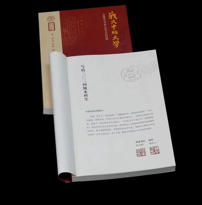 中国人民大学的入学礼也再次“上新”。精美的入学礼中,除了纪念徽章、立体书立,还附有一本成仿吾老校长编著的《战火中的大学——从陕北公学到人民大学的回顾》。书中记录了老校长对从陕北公学到华北联合大学再到华北大学的发展历程,以及中国人民大学创办和复校初期情况的珍贵回忆。